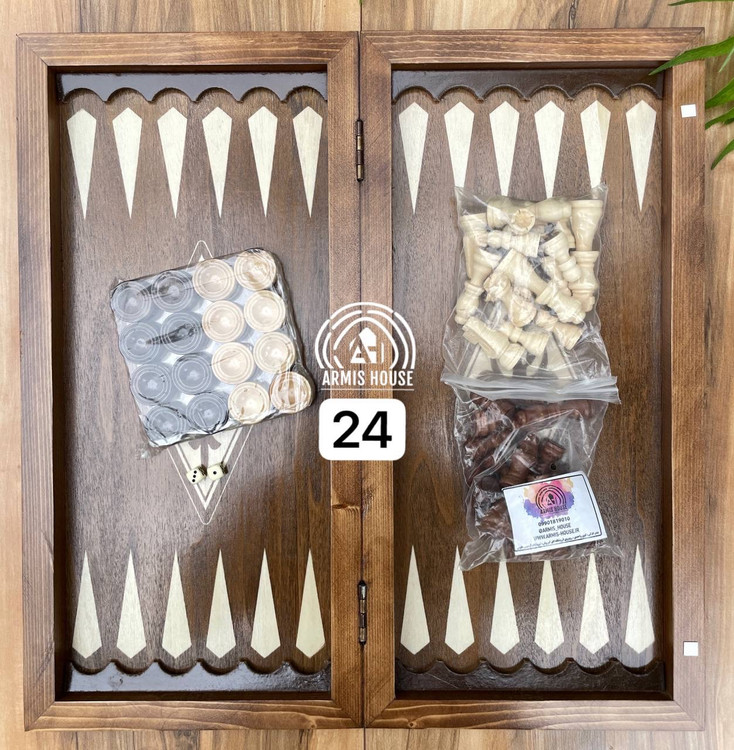 با تمام متعلقات ( تاس ، مهره تخته نرد ، مهره شطرنج ) : به منظور خرید شما به همراه (مهره و تاس تخته نرد) و مهره شطرنج درجه ی 1 صادراتی میباشد